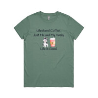 Weekend Coffee Just Me & My Husky , Life is Good, with coffee cup and a Husky